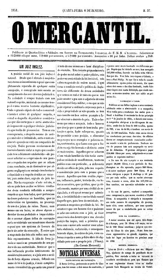 O Mercantil, edição nº 37, de quarta-feira, 8 de janeiro de 1851,