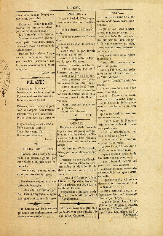 Com redação provisória na Rua Senador Feijó, 134 e publicação dominical - com planos de se tornar diário - o jornal santista A Opinião apresentava quatro páginas, como o exemplar da quarta edição, enviado à redação do jornal paulistano Diário Popular e preservado no Arquivo do Estado de São Paulo (acesso: 20/4/2013).