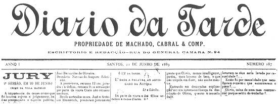 Temos em mãos cópia em xerox do número 187, ano 1, de 21 de junho de 1889. Toda a primeira página, sob o título Júri, com o subtítulo Crime da Vila Matias, compreendia o julgamento dos irmãos Antônio e Olívio Lima, indigitados autores da morte de Matias Costa, no dia 8 de maio de 1888.