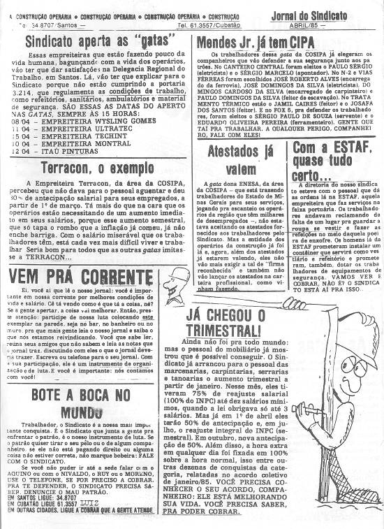 Reprodução da página 2 (verso) do boletim sindical Construção Operária, de abril de 1985
