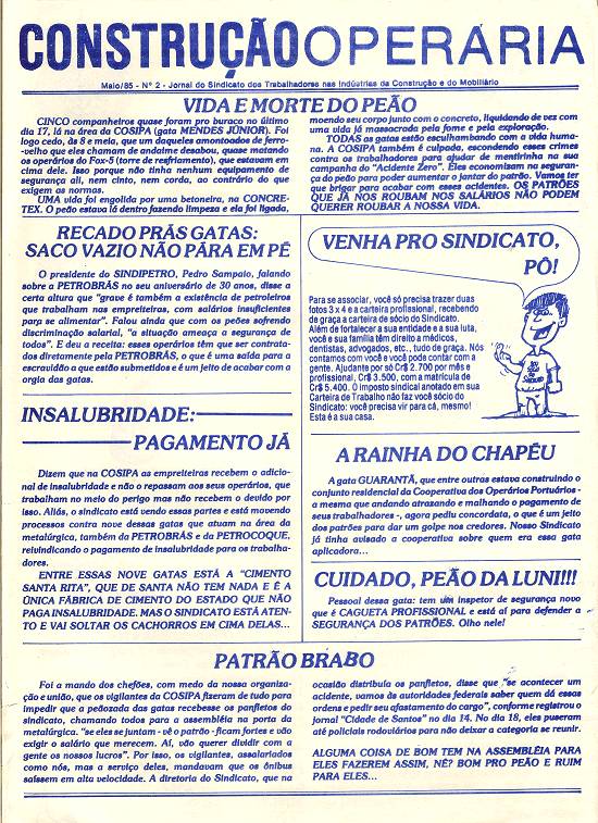 Reprodução da página 2 (verso) do boletim sindical Construção Operária, de maio de 1985