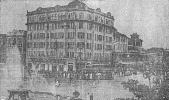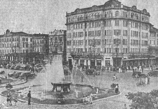 Atlântico Hotel, visto da Praça das Bandeiras (com a fonte luminosa Nove de Julho)