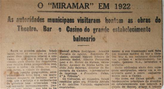 O antigo Miramar, com a radical reforma por que está passando, dará a Santos um grande impulso, dotando, ao mesmo tempo, a nossa cidade de um estabelecimento cujo gênero de diversões é, atualmente, o único existente no Brasil.