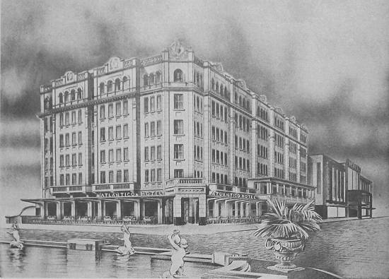 Situados no Gonzaga, em frente no mar, o Atlântico Hotel e seu Cassino, hoje totalmente reformados, atestam a larga visão dos seus diretores, dotando a cidade de Santos de um dos mais atraentes e modernos estabelecimentos no gênero. O Atlântico Hotel tem, além do mais, uma situação privilegiada. A paisagem que se descortina do cenário marítimo é ímpar em beleza e atração. Ambientes seletos, distintos e calmos, formam esse conjunto maravilhoso de distração e repouso.