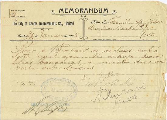 datado de 31 de janeiro de 1908, ao gerente do London Brazilian Bank, Limited em Santos: "Rogo a V. Sa. o favor de declarar ao pé deste qual o