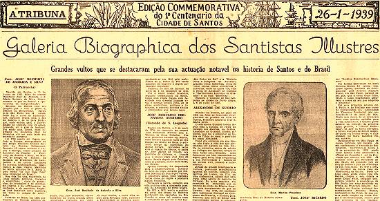 Na sua edição especial de 26 de janeiro de 1939, comemorativa do centenário da elevação de Santos à categoria de cidade (exemplar no arquivo do historiador Waldir Rueda), o jornal santista A Tribuna publicou esta matéria (grafia atualizada nesta transcrição):