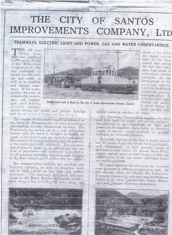 Esta antiga companhia foi registrada em 1880 e por decreto do governo brasileiro em 1882 foi autorizada a suprir a cidade com gás e água, bem como a estabelecer e operar bondes. Ela tem um negócio crescente de considerável importância e fornece gás e água, tração elétrica, energia elétrica para iluminação pública e particular e energia elétrica em Santos e São Vicente.