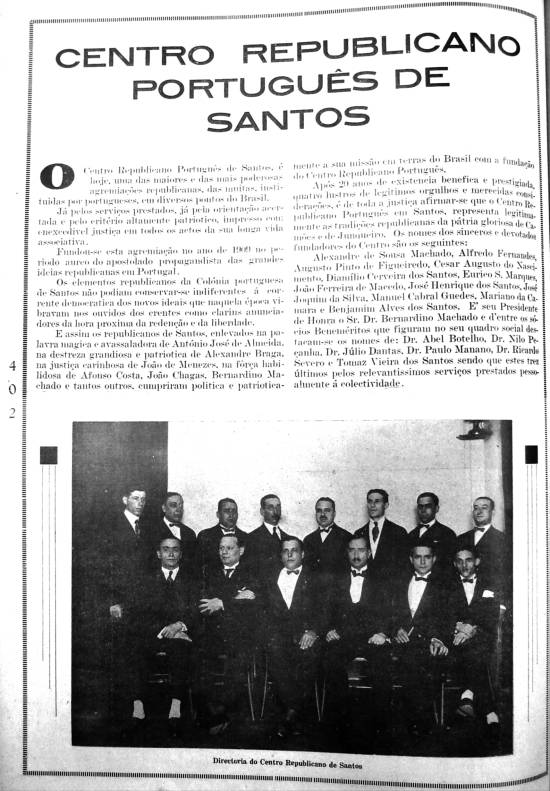 Após 20 anos de existência benéfica e prestigiada, quatro lustros de legítimos orgulhos e merecidas considerações, é de toda a justiça afirmar-se que o Centro Republicano Português de Santos representa legitimamente as tradições republicanas da pátria gloriosa de Camões e de Junqueiro.