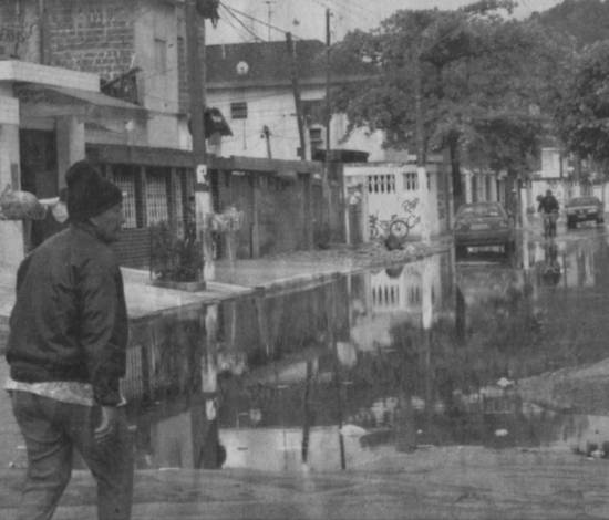 Não é de hoje que as enchentes castigam os moradores desta região de Santos. E quando não vem do céu, a água brota do solo por conta da maré alta, que faz canais transbordarem e, em alguns lugares, o esgoto voltar para dentro das residências.