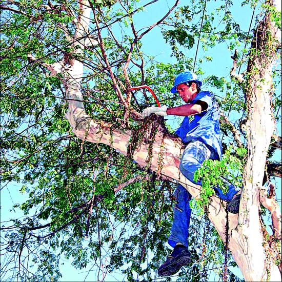 Os serviços de poda de árvores são realizados por uma empresa contratada pela