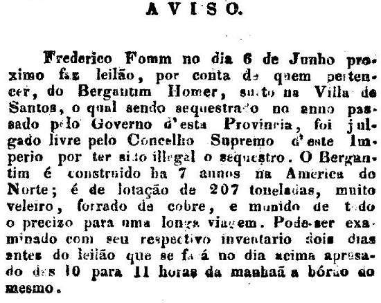 Frederico Fomm - Leilão de embarcação sequestrada em 1826, feito a bordo, no porto