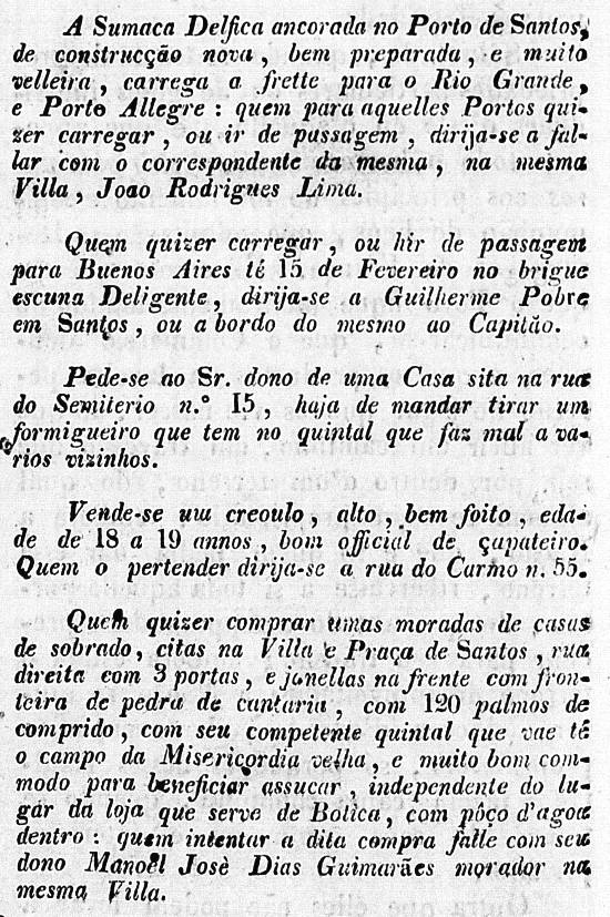 Carga na sumaca Delfica, passagem para Buenos Aires no Deligente, casa à venda na R.
