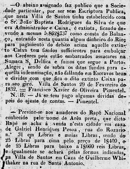 Acerto de Contas de Francisco Xavier de Oliveira Pimentel e venda de rapé nacional Arêa Preta