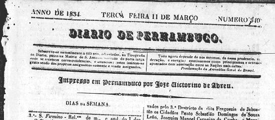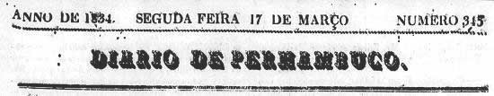Publicado no jornal Diário de Pernambuco, de Recife-PE, no número 345, de 17 de março de 1834, página 4 (acervo Memória Biblioteca Nacional Digital)