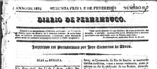 Publicado no jornal Diário de Pernambuco, de Recife-PE, no número 310, de 3 de fevereiro de 1834, página 4 (acervo Memória Biblioteca Nacional Digital)