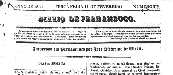 Publicado no jornal Diário de Pernambuco, de Recife-PE, no número 317, de 11 de fevereiro de 1834, página 4 (acervo Memória Biblioteca Nacional Digital)