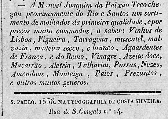 Sortimento de molhados de Manoel Joaquim da Paixão Teco Publicado no jornal O Novo Farol Paulistano, da capital paulista, no número 487, de 14 de dezembro de 1836, página 7 (acervo Memória Biblioteca Nacional Digital)
