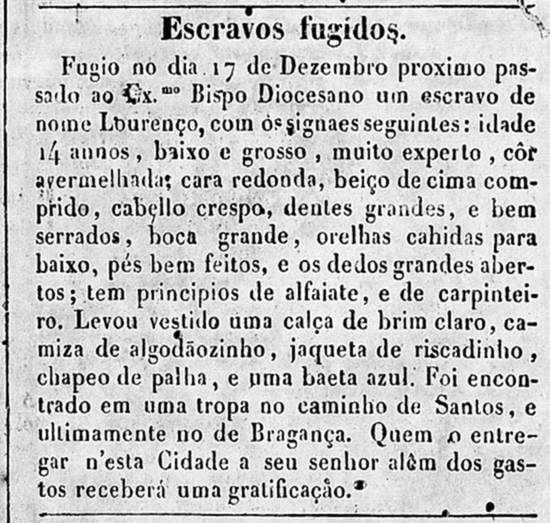 Escravo do bispo, fugido, visto na estrada de Santos Publicado no jornal O Novo Farol Paulistano, da capital paulista, no número 498, de 21 de janeiro de 1837, página 4 (acervo Memória Biblioteca Nacional Digital)