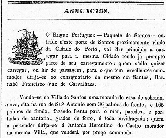 Brigue português Paquete de Santos, tendo como consignatário Barnabé Francisco Vaz de