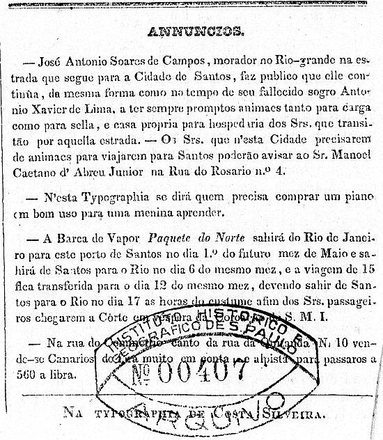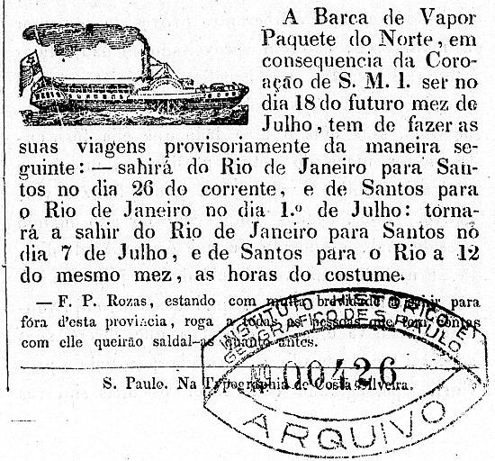 Barca a vapor Paquete do Norte - escala alterada pela coroação do imperador em 18/7/1841