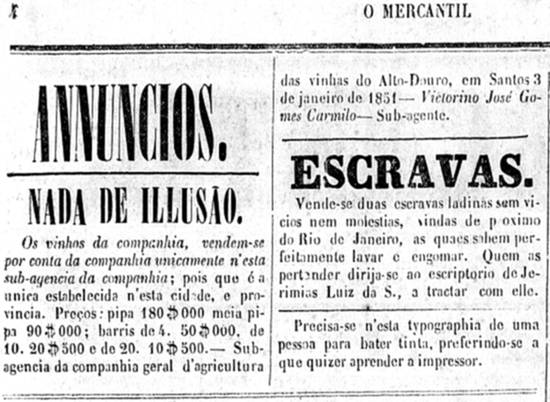 Anúncios diversos - vinhos, escravas, funcionário para tipografia
