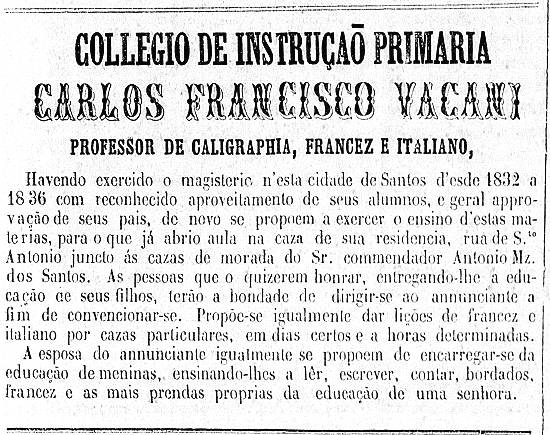 Colégio de instrução primária de Carlos Francisco Vacani - ensina caligrafia,  francês e italiano