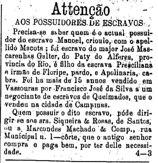 “Atenção./Aos possuidores de escravos:/Precisa-se saber
