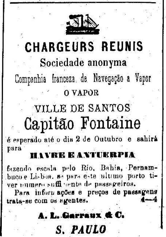 A. L. Garraux & C. - agentes da armadora francesa Chargeurs Reunis - vapor Ville de Santos