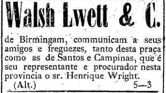 Walsh Lwett & C., de Birmingam, na Inglaterra, têm Henrique Wright como representante e procurador