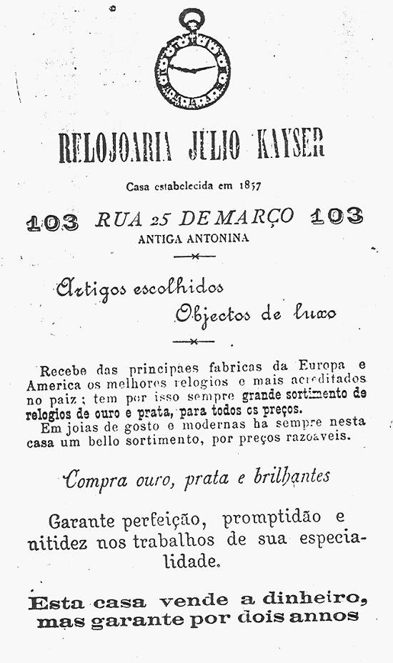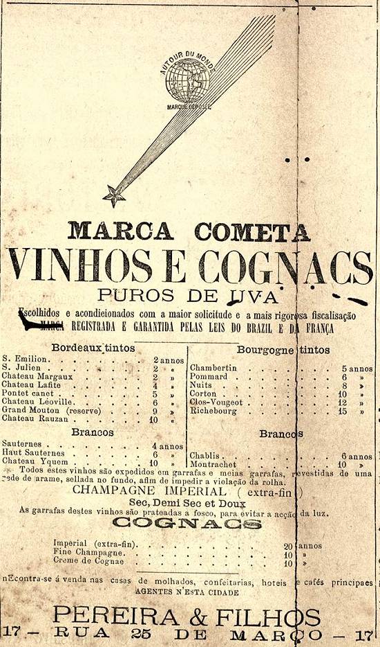 Pereira & Filhos, importadores de vinhos e conhaques franceses, na antiga Rua 25 de Março, (atual Rua XV de Novembro), 17, no Centro