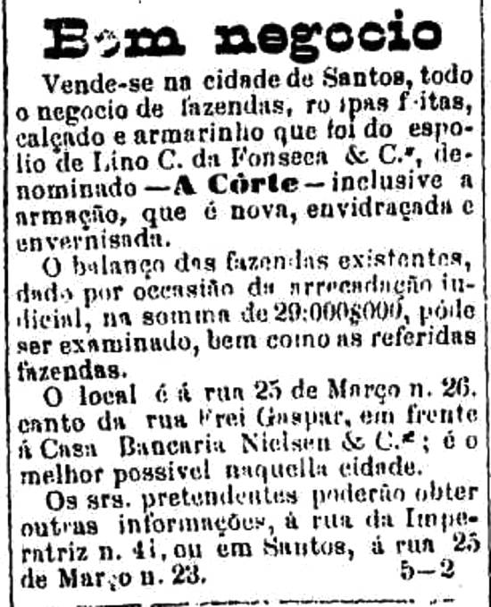 Vende-se negócio de fazendas, roupas feitas, calçado e armarinho do espólio de Lino C. da Fonseca