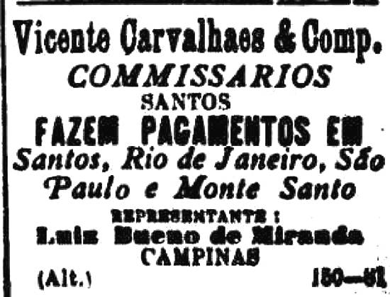 Vicente Carvalhaes & Comp. - comissários em Santos Publicado no jornal O Estado de São Paulo em 17 de fevereiro de 1890, página 3 (Acervo Estadão)