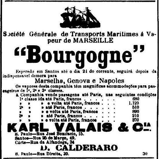 Karl Valais & Cia. - agentes de Société Générale de Transports Maritimes á Vapeur de Marseille Publicado no jornal O Estado de São Paulo em 17 de fevereiro de 1890, página 3 (Acervo Estadão)