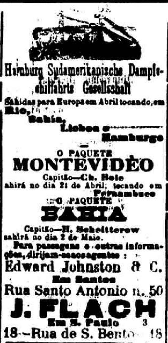 Edward Johnston & C. - agentes em Santos da armadora alemã Hamburg Sudamerikanische Dampfschiffahrts Gesellschaft Publicado no jornal O Estado de São Paulo em 20 de abril de 1890, página 4 (Acervo Estadão)
