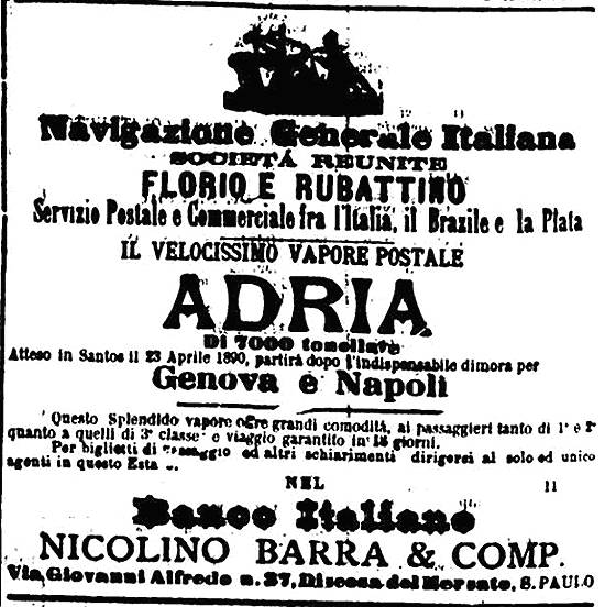 Nicolino Barra & Comp./Banco Italiano - agente de Navigazione Generale Italiana Societá Reunite Florio e Rubattino - serviço postal e comercial entre Itália, Brasil e Bacia do Prata Publicado no jornal O Estado de São Paulo em 20 de abril de 1890, página 4 (Acervo Estadão)