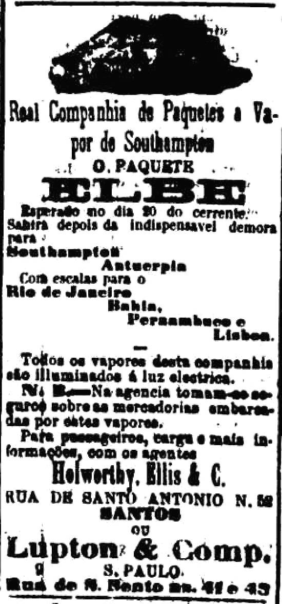 Holworthy, Ellis & C., agente/Santos de Real Companhia de Paquetes a Vapor de Southampton Publicado no jornal O Estado de São Paulo em 20 de abril de 1890, página 4 (Acervo Estadão)