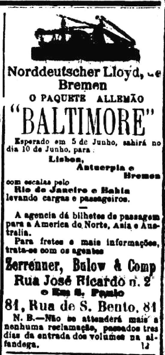 Zerrenner, Bülow & Comp. - agentes da armadora Norddeutscher Lloyd de Bremen, Alemanha Publicado no jornal O Estado de São Paulo em 29 de maio de 1890, página 4 (Acervo Estadão)