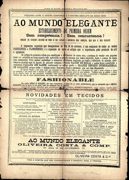 Ao Mundo Elegante, de Oliveira Costa & Cia. na Rua XV de Novembro, 77: "Pequeno lucro e inteira confiança, é o sistema absoluto de nossa casa". Em agosto abrirá a filial Rayon de Modas, em palacete contíguo, ficando no antigo prédio o Grande Depósito Internacional de Calçados Publicado no jornal Diário de Santos, em 28 de julho de 1890, página 4 Imagem: Hemeroteca da Biblioteca Nacional - Rio de Janeiro/RJ