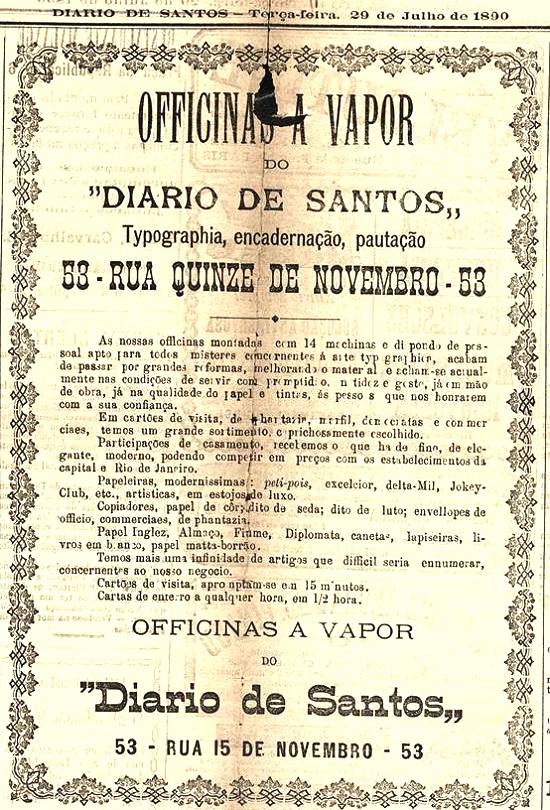 Oficinas a Vapor do 'Diário de Santos' - tipografia - impressos em geral Publicado no jornal Diário de Santos, em 29 de julho de 1890, página 4 Imagem: Hemeroteca da Biblioteca Nacional - Rio de Janeiro//RJ