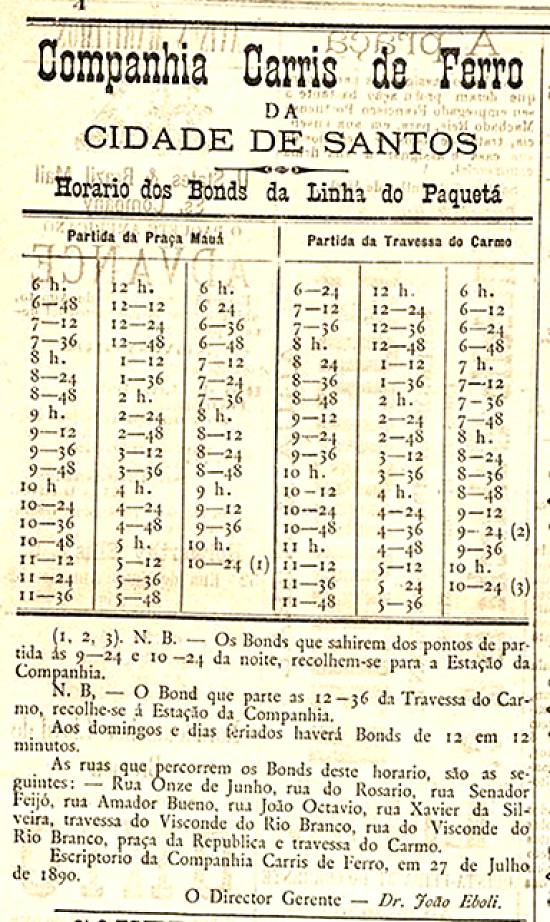 Companhia Carris de Ferro da Cidade de Santos - o diretor gerente Dr. João Eboli comunica horários dos bondes da Linha do Paquetá para a Praça Mauá e para o Largo do Carmo (atual Praça Barão do Rio Branco) Publicado no jornal Diário de Santos, em 29 de julho de 1890, página 4 Imagem: Hemeroteca da Biblioteca Nacional - Rio de Janeiro/RJ