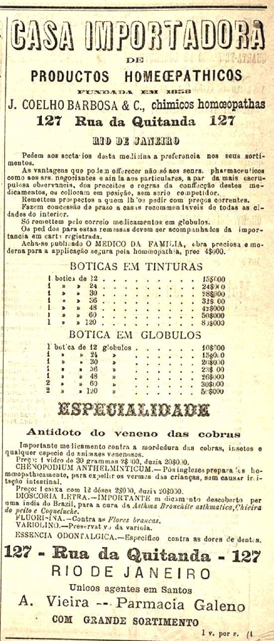 Casa Importadora de Produtos Homeopáticos, estabelecida no Rio de Janeiro em 1858, tendo como único agente em Santos a "Parmacia" Galeno, de A. Vieira Publicado no jornal Diário de Santos, em 29 de julho de 1890, página 4 Imagem: Hemeroteca da Biblioteca Nacional - Rio de Janeiro/RJ