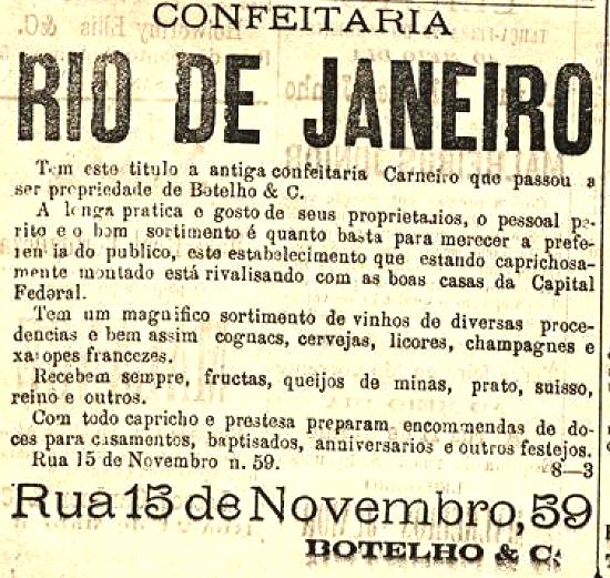 Antiga Confeitaria Carneiro passou ao nome de Confeitaria Rio de Janeiro, sob a direção de Botelho & C., na Rua 15 de Novembro, 59, em Santos