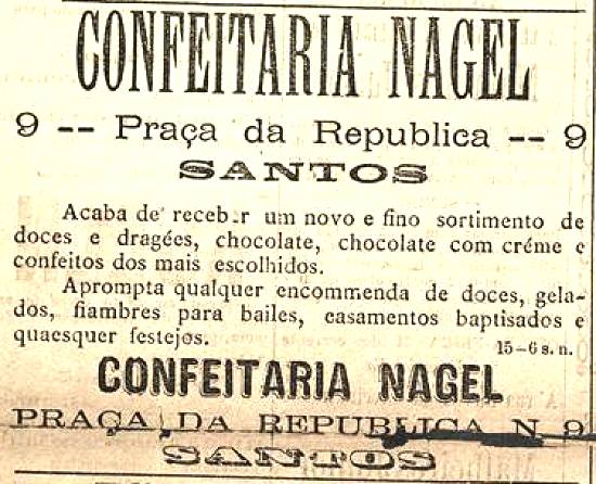 Confeitaria Nagel, na Praça da República, 9, em Santos, tem novo e fino sortimento de produtos e aceita encomendas para festas Publicado no jornal Diário de Santos, em 29 de julho de 1890, página 4 Imagem: Hemeroteca da Biblioteca Nacional - Rio de Janeiro/RJ
