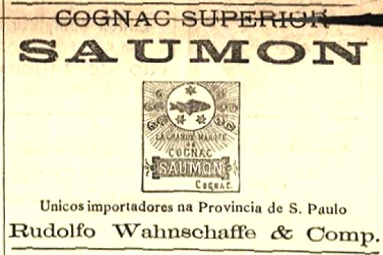 Conhaque Superior Saumon tem como únicos importadores paulistas a firma Rudolfo Wahnschaffe & Comp. Publicado no jornal Diário de Santos, em 29 de julho de 1890, página 4 Imagem: Hemeroteca da Biblioteca Nacional - Rio de Janeiro/RJ