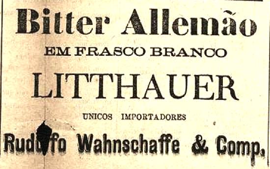 Bitter alemão em frasco branco Litthauer tem como únicos importadores a firma Rudolfo Wahnschaffe & Comp., de Santos Publicado no jornal Diário de Santos, em 29 de julho de 1890, página 4 Imagem: Hemeroteca da Biblioteca Nacional - Rio de Janeiro/RJ