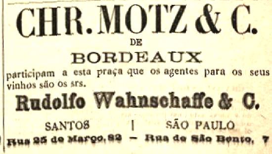 Produtores de Bordeaux, na França, comunicam que a agente para seus vinhos em Santos e São Paulo é a firma Rudolfo Wahnschaffe & Comp., de Santos Publicado no jornal Diário de Santos, em 29 de julho de 1890, página 4 Imagem: Hemeroteca da Biblioteca Nacional - Rio de Janeiro/RJ