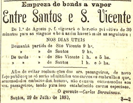 Empresa de bondes a vapor entre Santos e S. Vicente altera horário das linhas e alerta que só admitirá embrulhos dos passageiros que puderem ser acomodados debaixo dos bancos, sem causar incômodos Publicado no jornal Diário de Santos, em 31 de julho de 1890, página 4 Imagem: Hemeroteca da Biblioteca Nacional - Rio de Janeiro/RJ