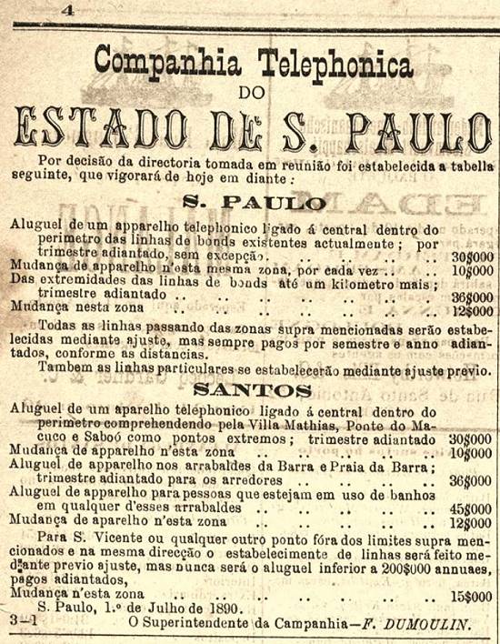Companhia Telephonica do Estado de S. Paulo: tabela de aluguel de aparelhos e outros serviços Publicado no jornal Diário de Santos, em 2 de agosto de 1890, página 4 Imagem: Hemeroteca da Biblioteca Nacional - Rio de Janeiro/RJ
