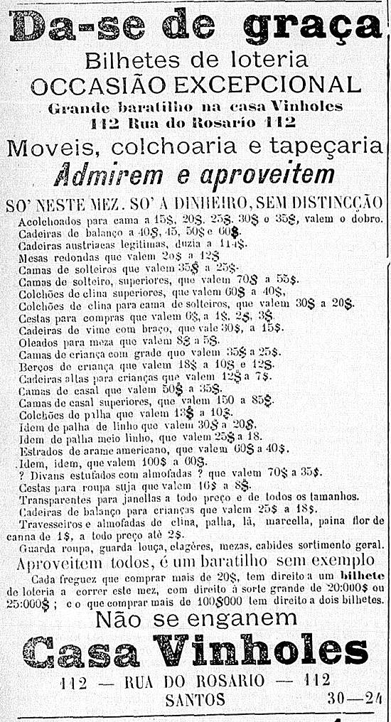 Casa Vinholes: "baratilho", dando de graça os móveis, produtos de colchoaria e tapeçaria e premiando as compras com bilhetes de loteria, na antiga Rua do Rosário (atual Rua João Pessoa), 112