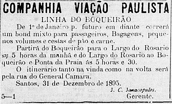 Companhia Viação Paulista informa por seu gerente J. C. Janacopulos que a partir de 1º de janeiro de 1896 correrá um bonde misto para passageiros, bagagens, pequenos volumes e cestas de páo e carne, entre o Boqueirão e o Largo do Rosário (atual Praça Rui Barbosa), via Rua General Câmara